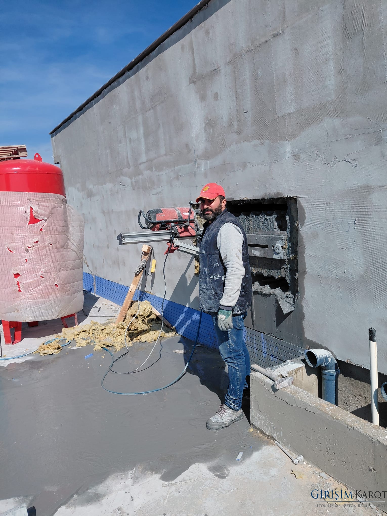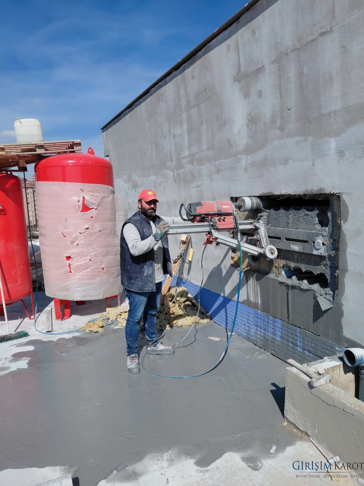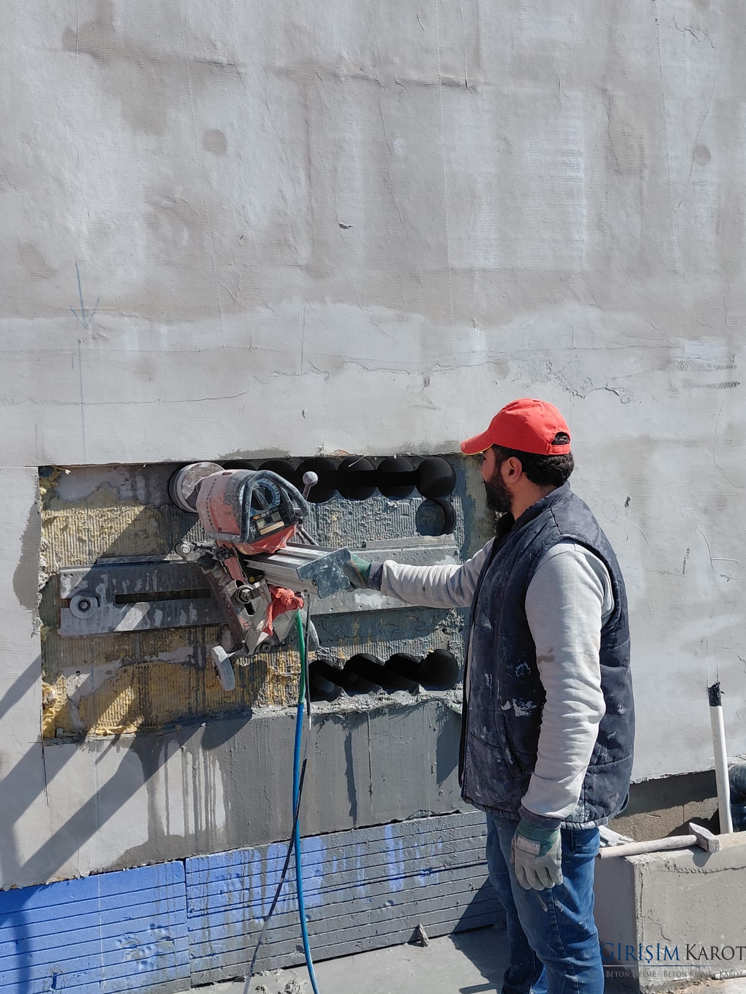 Elmas uçlu karot matkabı, su soğutmalı sistemle betonu keser. Bu yöntem:
